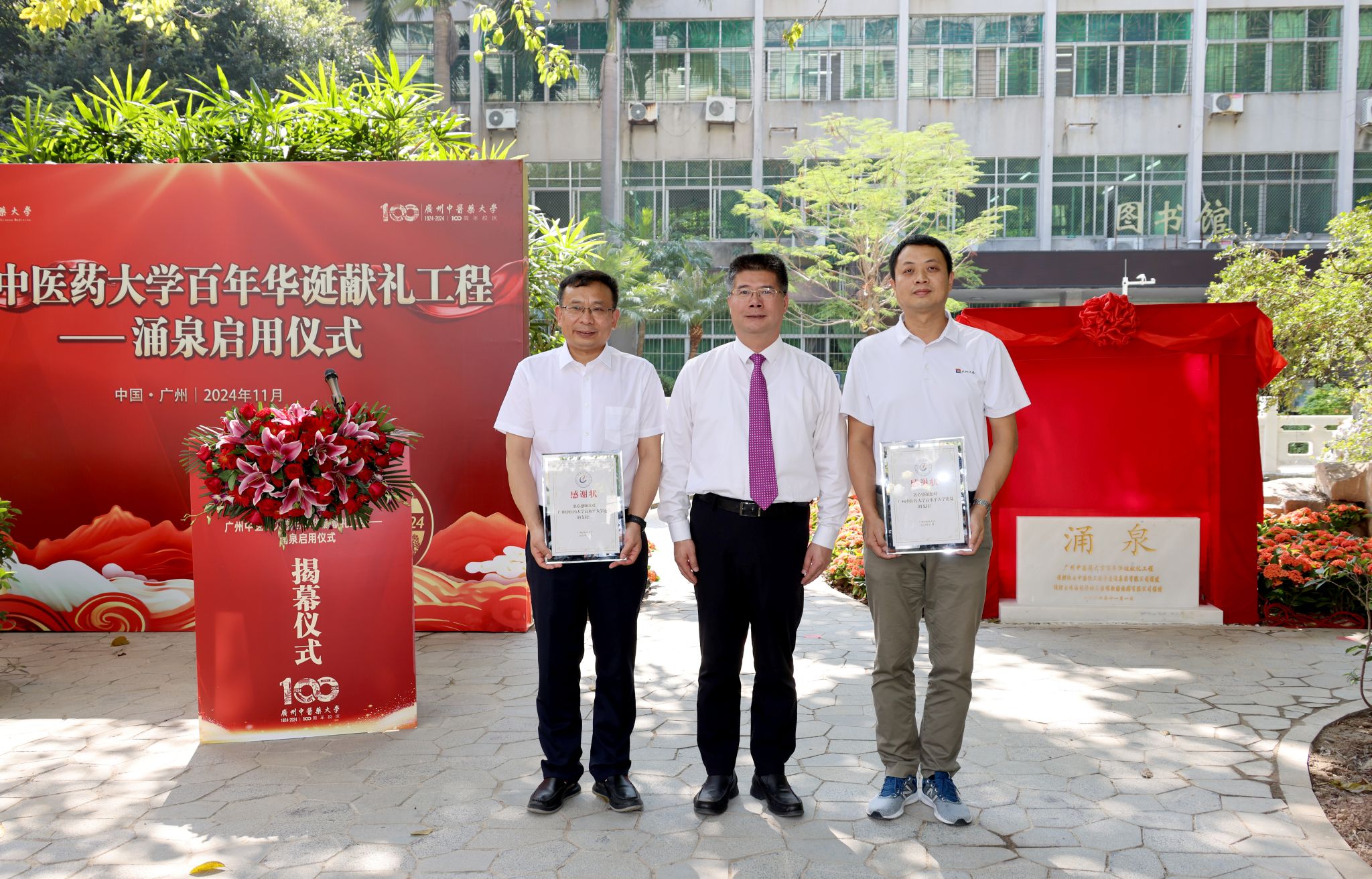 邱亚洪在致辞中表示,“涌泉”锦鲤池是学校三元里校区校园更新、人居环境综合治理提升项目的重要组成部分。学校党委主要负责同志时刻紧盯项目进度,相关职能部门抓紧推进相关工作。珠海华发集团、圆明新园多次派出专家团队到校实地勘察指导鱼池修缮,中国铁工集团慷慨解囊捐资扩建锦鲤池。他指出,中医针灸学有“涌泉穴”,具有众多保健和治疗作用。“滴水之恩,当涌泉相报”。学校取名锦鲤池“涌泉”,亦寓意学校对建设方和捐赠方的感恩之情。书山探径,锦池寻踪。锦鲤池背靠图书馆,倚堆叠的石山,并于“医圣”张仲景的雕像为邻。高山流水,杏林问道,为学校百年华诞献上最美好的祝愿。