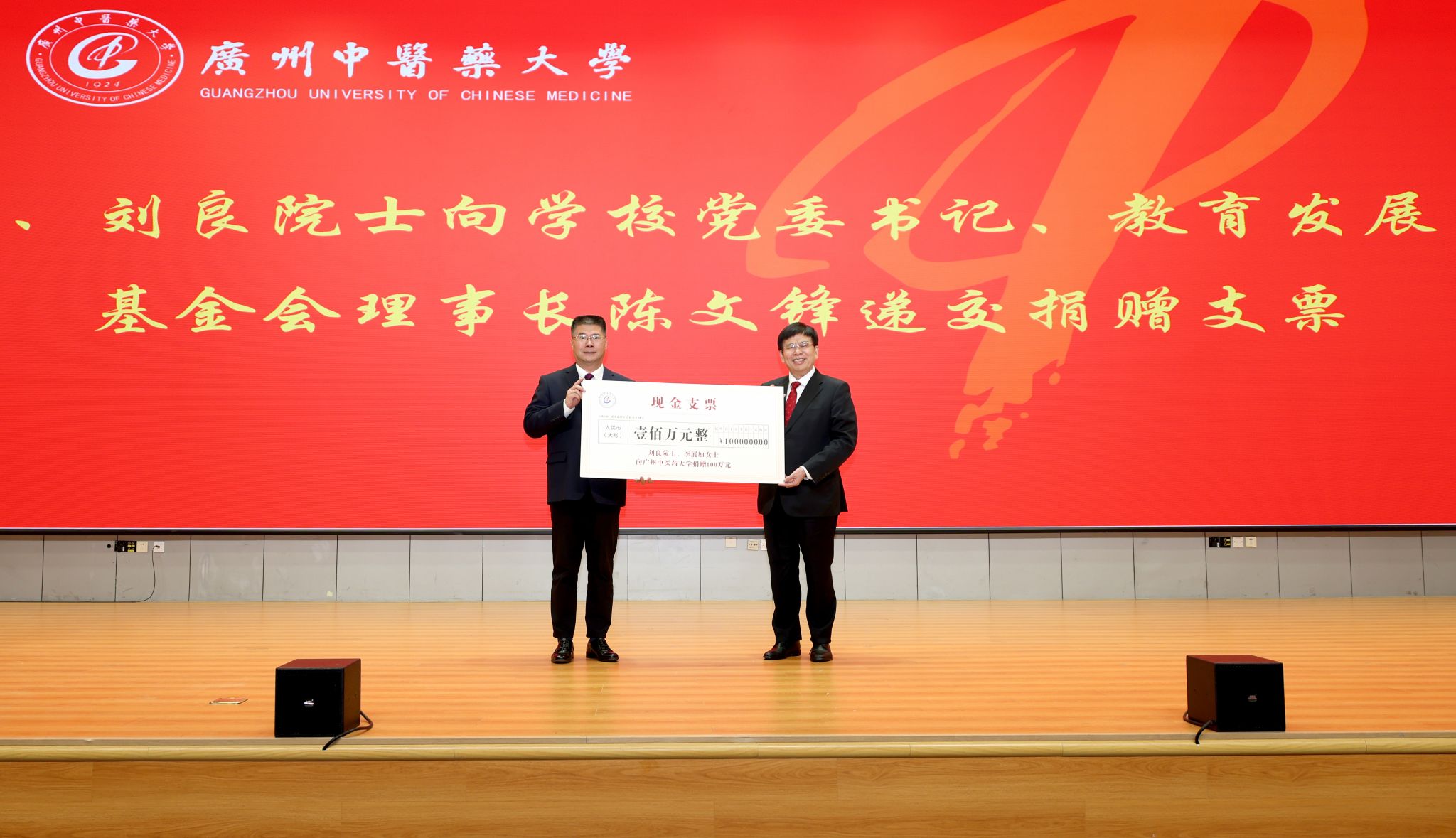 陈文锋向刘良院士伉俪的慷慨捐赠表示了诚挚的感谢,并指出,“刘李中医药创新奖”的设立是刘良院士伉俪对母校深厚情谊的彰显,是对母校的热爱与回馈,更是科学家、教育家、医学家奖掖后学的育人精神的生动体现,将有效地助力学校进一步发挥教学、科研、医疗等多方面优势,为党和国家培养品学兼优的中医药高端研究和技术人才,为高质量推进“双一流”和高水平大学建设贡献力量,也将有效激励全校师生员工赓续学校精神血脉,接续创新奋斗。他表示,学校将不断提升办学育人质量,开辟建设“中国特色、世界水平”的一流大学新局面,以更有标志性、辨识度的广中医贡献回报校友、回报社会各界的关怀和厚爱。他要求全校党员干部师生员工要永葆“闯”的精神、“创”的劲头、“干”的作风,推动工作见行见效,以教学、科研、医疗、文化、对外交流等各项事业高质量发展的实绩、成效推进学校教育、科技、人才“三位一体”综合改革,以此向学校百年华诞献礼,为强国建设、为民族复兴伟业、为实现中国式现代化贡献广中医智慧、广中医力量。