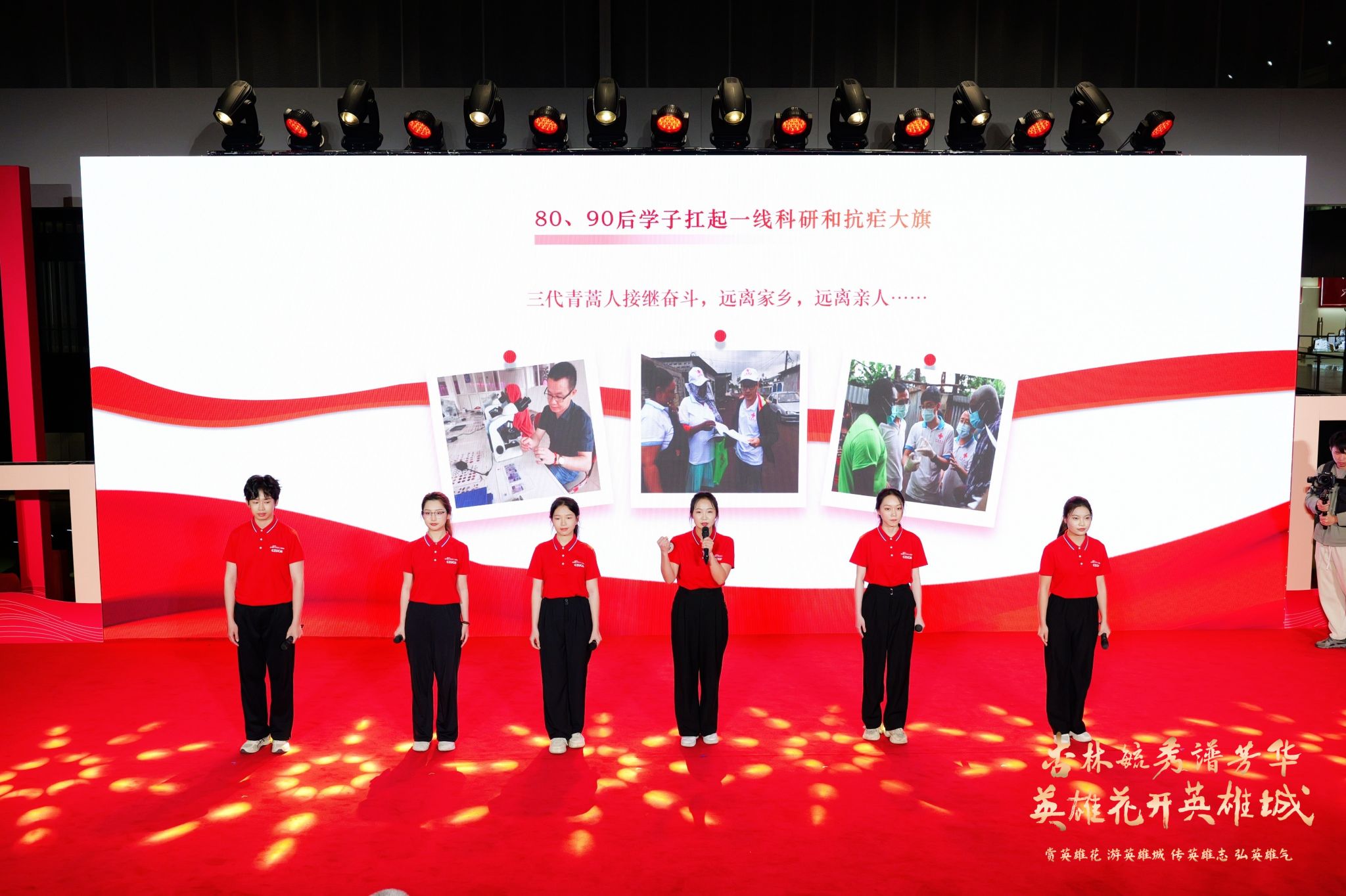音诗画《英雄花的约定》创新融合情景表演与多媒体视觉艺术,第一附属医院的医务工作者以白衣为甲,深情演绎医者仁心与家国情怀的永恒交响。