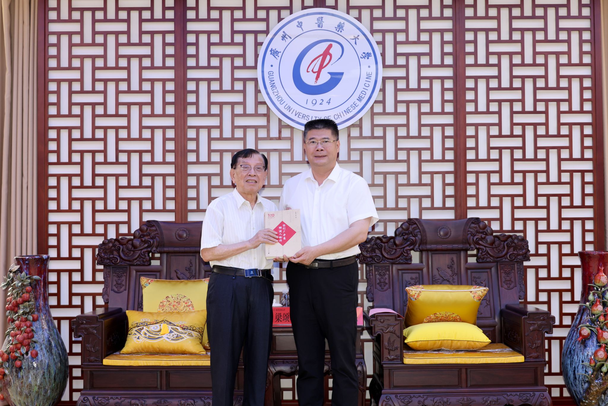 陈文锋代表学校向梁老赠送著作《世纪广中医·精诚人物传》(其中收录梁老事迹)、百年校庆历史校门屏风文创纪念品。梁颂名教授向学校赠送书籍《梁氏医脉》。