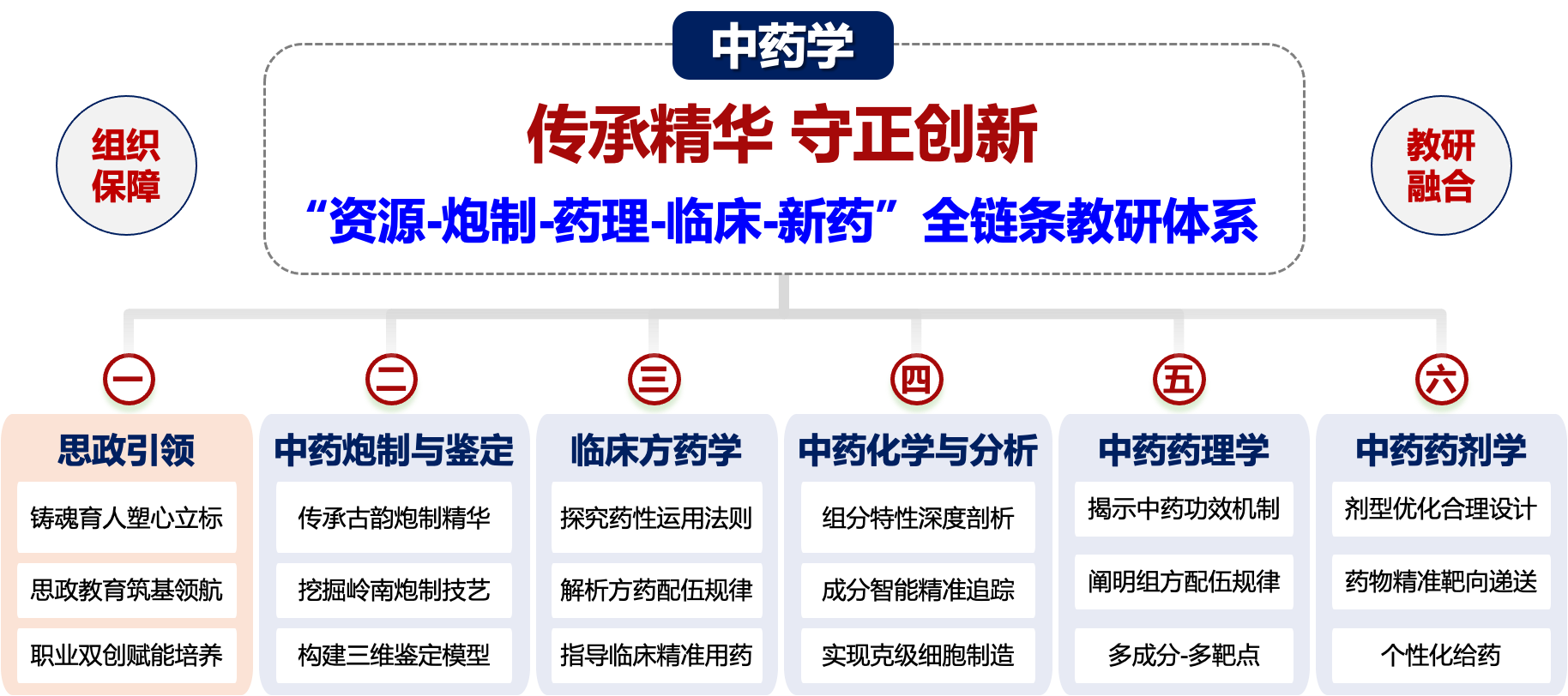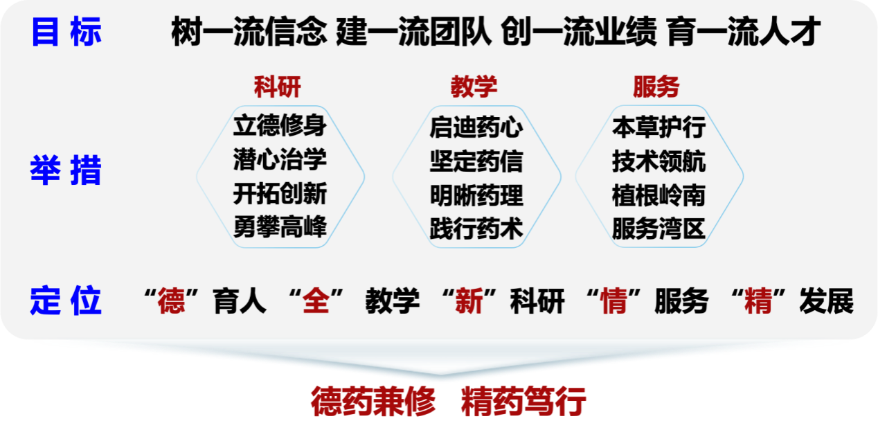 中药学守正创新教师团队秉承“传承精华、守正创新”初心,以“崇德远志、和衷有容、汲古求新、笃学精业”的大学精神为引领,创建“立足岭南、联动湾区、辐射海外”的大中药育人模式,以“思政第一课”筑牢信仰之堤,“中药思政故事”厚植家国情怀。聚焦中药重大科学问题与临床需求,实现炮制鉴定、药效物质、临床药理、制剂研发四大方向协同攻关,形成“基础-临床-产业”多学科交叉全链条创新生态和创新团队,助力岭南名优产品迭代升级,赋能中药合理用药和临床推广;同时,积极发挥科研、人才和平台优势,构建“ 三位一体”产学研联合体,多元化服务区域经济社会发展,成为中医药高质量发展的“岭南基地”,为推动学校“双一流”和高水平大学内涵式高质量发展做出不懈努力。