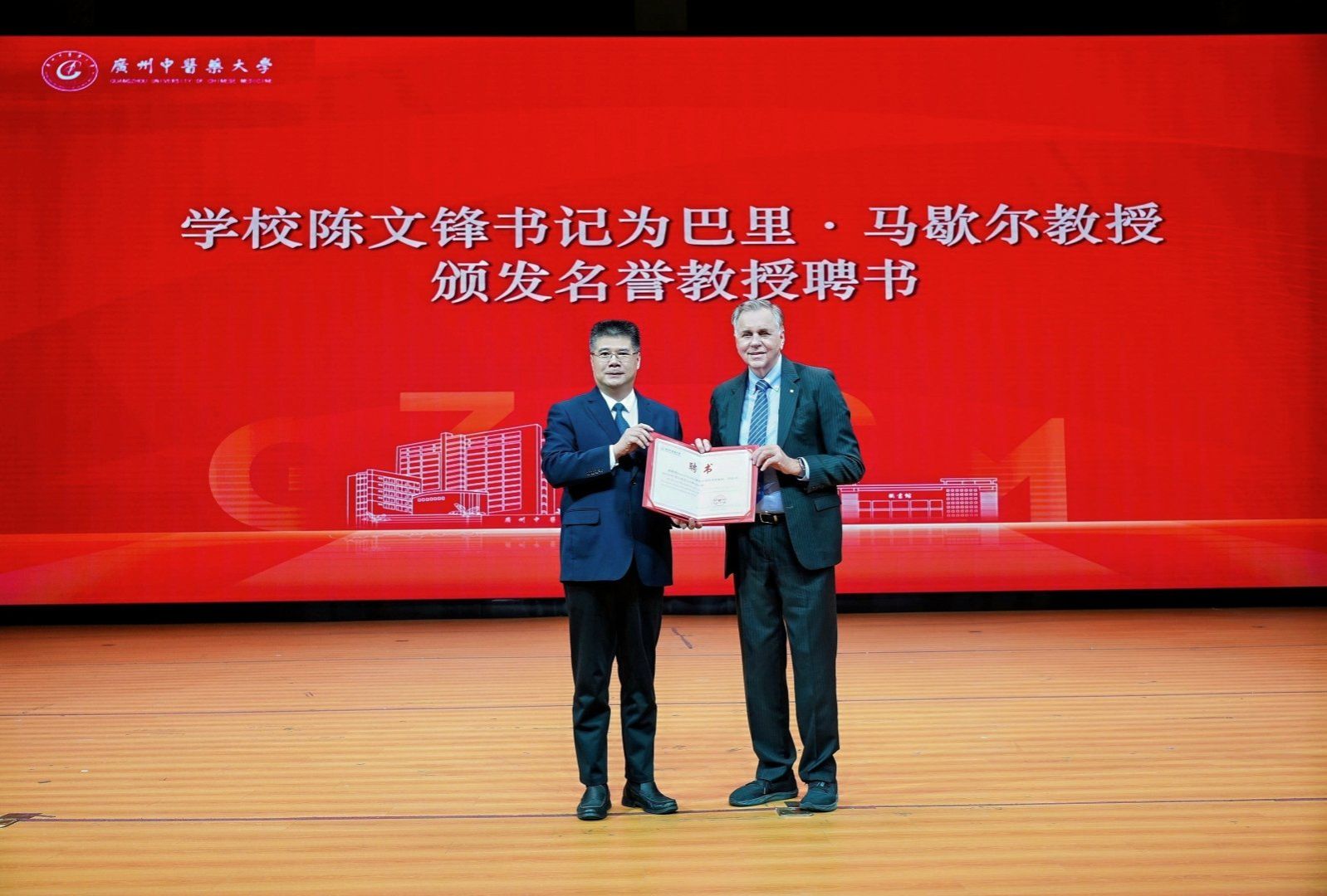马歇尔教授出席“中西互鉴,守正创新——诺贝尔生理学或医学奖得主巴里·马歇尔专题报告会暨2026年研究生导师专题培训会(第二期)”。陈文锋书记为马歇尔教授颁发名誉教授聘书,刘中秋副校长主持报告会。