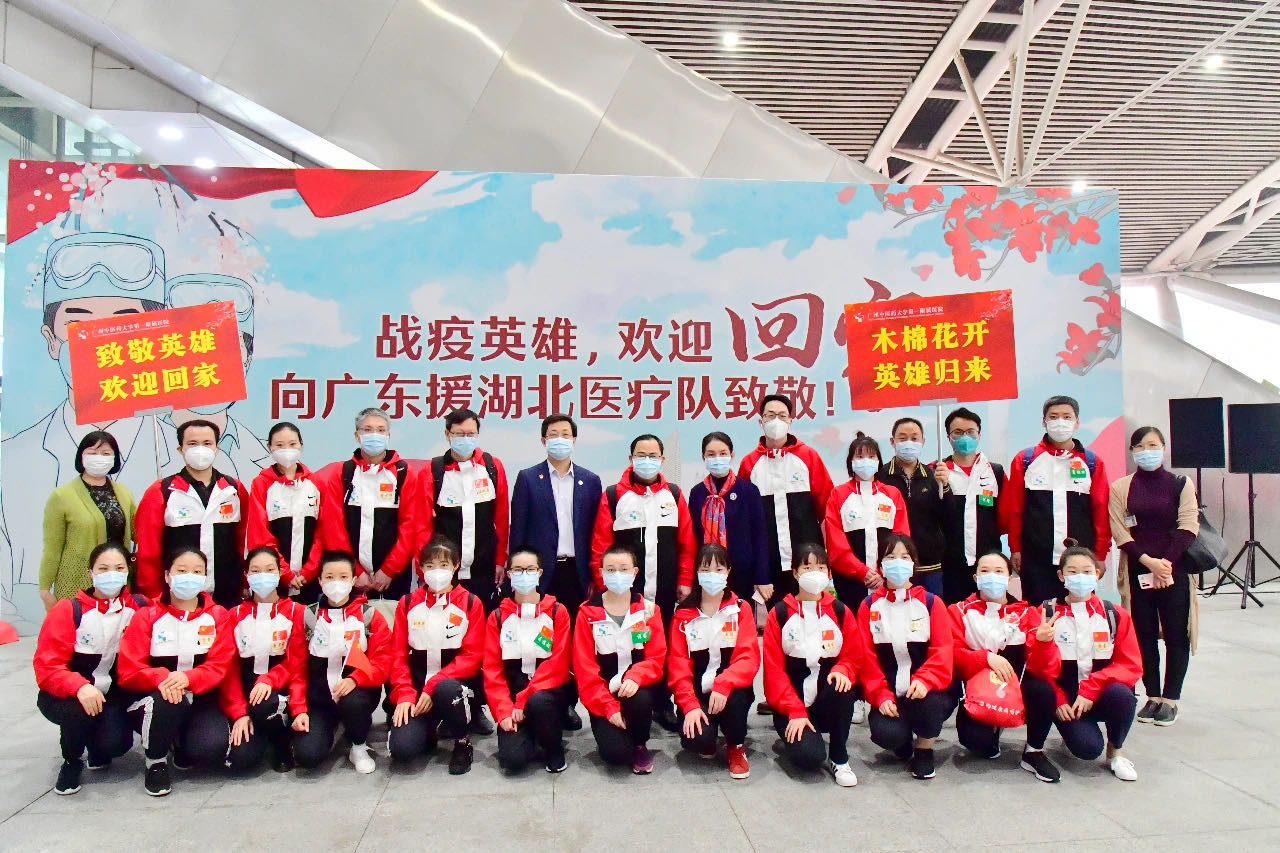3月20日上午,beat365官网第一附属医院、第二附属医院(广东省中医院)驰援湖北的65名医护人员,分别从武汉、荆州出发,随同广东援助湖北医疗队,于傍晚抵达广东南站。