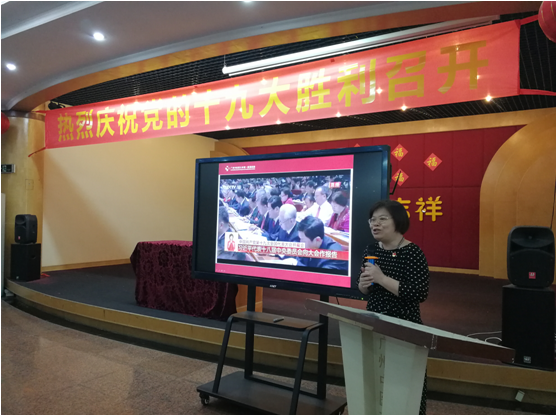 陈小花结合参会所见所闻所感所悟,对党的十九大各项议程进行了生动回顾,传达了十九大报告的主要精神。她指出,党的十九大是一次具有划时代、里程碑意义的历史性盛会,回顾了一段光辉的奋斗历程,选出了一个卓越的领导核心,形成了一个博大精深的思想理论体系,走上了一条宽广光明的复兴之路,明确了一个马克思主义执政党的时代责任,展示了一个自信负责的大国形象。