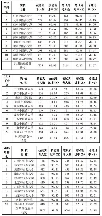 实现“百万中医师”的目标,当务之急并非扩大中医药院校招生人数,而是找出影响执业医师考试成绩的因素,提高医考通过率,避免中医人才流失。为此,国家中医药管理局中医师资格认证中心对近4年来中医类别执业医师资格考试情况进行统计分析,试图从中找出考试通过率的影响因素。他们对全国24所高等中医药院校的医考通过率进行排名,排名结果显示,医考成绩关键在院校教育。