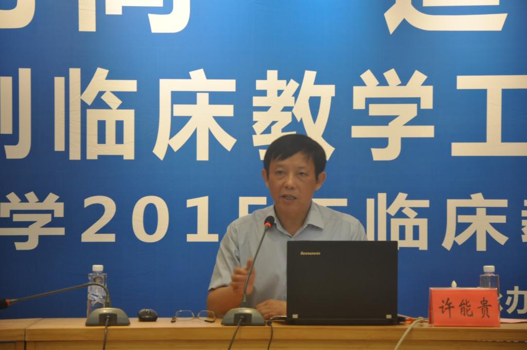 许能贵以“新形势,新起点,实现临床教育教学改革新跨越”为题,作2015年临床实践教学工作报告。他从临床教学总体情况、基地建设、师资培养、教学改革、教学督导、以赛促教、工作成效、问题与对策等八个方面,系统回顾了2014-2015学年临床教学工作的新业绩与新举措。同时,着眼于新形势下的新精神和新任务,他提出了2015-2016学年的重点教学改革与实践教学工作要点:一、进一步强化附属医院(临床医学院、基地)“育人”重要职能,彰显大学附属医院的社会贡献与价值体现,实现医疗、教学、科研同步发展。二、学校将积极指导、参与、支持医院的各项育人工作。加强人才培养方案的顶层设计,统筹协调各类型学生\规培生的临床轮训,整合优质临床教学资源,并实施全过程、标准化的质量监控。三、加强评价与激励机制的优化。各医院要认真研究制定新形势下各临床科室的职能设定及教学目标的定位,积极构建“临床医学院(医院)—教学管理部门(教学处、继续教育处、科教科等)—临床科室”三级规培管理体系与考核指标体系,加大基地建设与教学条件保障投入,并发挥临床医学院对其他规培基地的协同、辐射带动作用。