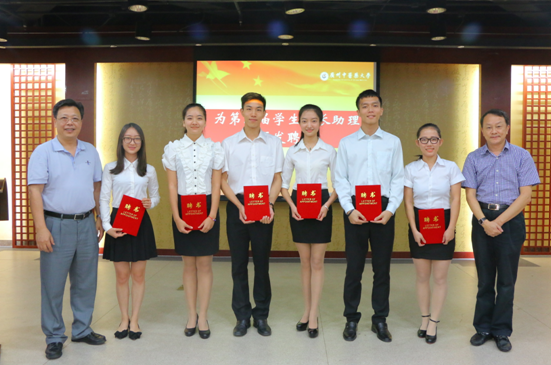 9月23日下午,第三届学生校长助理聘任仪式在大学城校区举行,校长王省良亲自为倪泽杰、曾遥、玄烨三位首届学生校长助理颁发荣誉证书,并为第三届学生校长助理张天鸽、黄华斌、黄茜茜、黄智利、罗振海、毕姗姗等6名同学颁发聘书。仪式由学校党委副书记陈英华主持,团委书记温祥彬宣读了《关于beat365英国官网网站第三届学生校长助理任职的通知》。学校相关党政职能部门负责领导、各二级学院分管学生工作院领导以及来自各学院百余名学生代表到场共同见证。