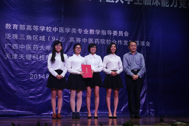 11月28-29日,在广西南宁举行的"天堰杯"第二届泛珠三角区域中医大学生临床能力竞赛上,beat365官网2010级4名同学组成的代表队,凭借扎实的中医基础理论知识功底和娴熟的临床操作技术荣获大赛团体一等奖,第一临床医学院中西医临床医学专业黄秀芳同学同时斩获中医学基本理论知识考核、舌诊与脉诊技能竞赛和针灸技能竞赛3项一等奖。来自广东、福建、云南、贵州、四川、江西、湖南、海南、广西等地的中医院校及相关专业高等院校和香港中文大学、香港浸会大学、澳门科技大学等15所院校的师生代表参加了比赛。