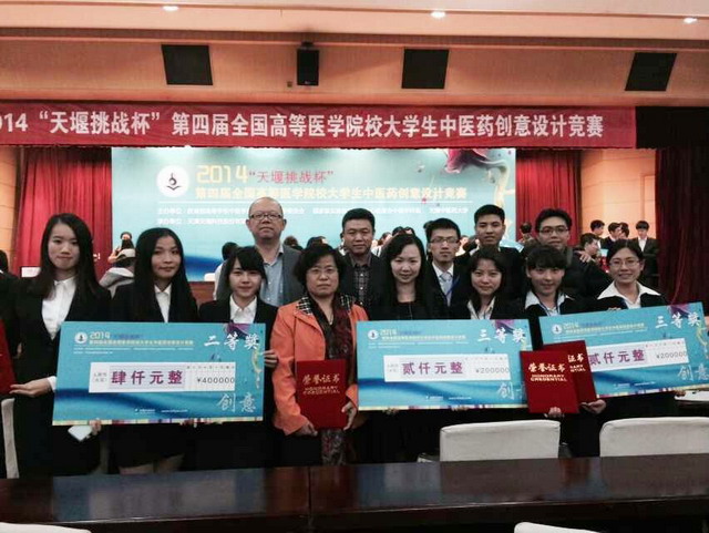 2014年11月1日,第四届"天堰挑战杯"全国高等医学院校大学生中医药创意设计竞赛决赛在天津中医药大学举行。beat365官网第一临床医学院学生赵丽娴团队的作品《中医药文化与3D压花工艺》获得大赛空间类二等奖(指导老师:陈国菊、陈文桂);第二临床医学院学生黄俊廷团队的作品《国医圣手出诊游戏学习软件》(指导老师:钟天送)和谢宛君团队的作品《手机APP应用类中医养生文化传播载体的设计与实现》(指导老师:刘焕兰)获得大赛新媒体类三等奖。同时,beat365官网还获得大赛"优秀组织奖",成为五个获奖中医药高校之一。