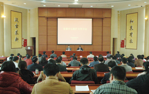 3月21日,校党委召开理论中心组扩大学习会,听取全国人大常委、学校副校长陈蔚文传达全国两会精神,并学习中央新修订的《党政领导干部选拔任用工作条例》。党委书记黄斌主持会议。