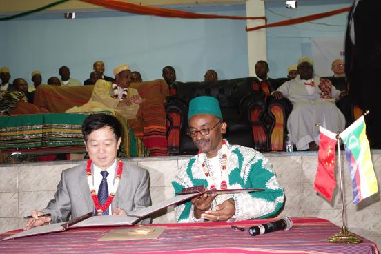 中国驻科摩罗大使王乐友先生(左)与科摩罗副总统福阿德•穆哈吉先生(Dr Fouad Mouhadjou)(右)签署交接文书