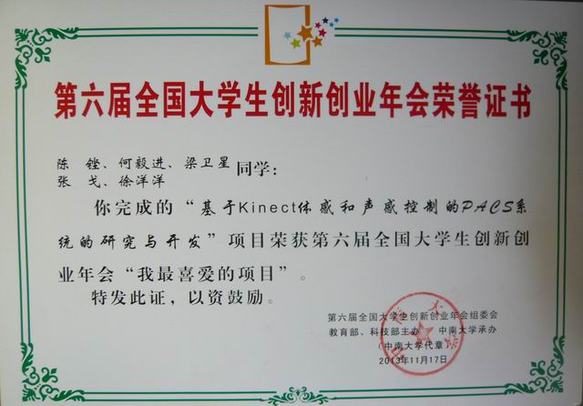 11月16日-17日,由教育部、科技部联合主办的第六届全国大学生创新创业年会在中南大学隆重举行,来自全国160余所高校的师生代表参加了此次年会,beat365官网医学信息工程学院学生陈铿、何毅进、梁卫星、张戈、徐洋洋完成的项目(指导老师:陈平平、赵文光、谭定英)"基于Kinect体感和声感控制的PACS系统的研究与开发"入选此次年会展示项目,并荣获第六届全国大学生创新创业年会"我最喜爱的项目"。