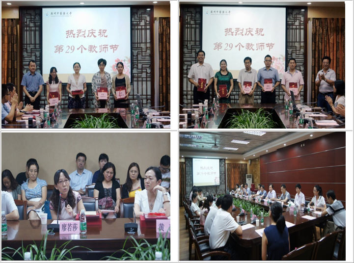 孙晓生代表学校向在座的教师和学校全体教职员工致以节日的祝贺和问候,希望广大教师牢记新时代的要求,立德树人,进一步加强师德师风建设,在人才培养、科学研究、社会服务、文化传承创新等方面取得新成绩。经管学院11级国贸专业学生罗晶晶代表全体学生向老师送上崇高的敬意和节日的祝福,表示一定牢记"厚德博学、精诚济世"的校训,以出色的表现回报学校的教育和培养。许能贵宣读了《关于公布第十六届"新南方教学奖励基金"评奖结果的通知》,王省良、陈英华分别为第十六届"新南方教学奖励基金"优秀教师和优秀党政管理工作者、第十六届"新南方教学奖励基金"优秀教师提名奖和优秀党政管理工作者提名奖获得者颁发荣誉证书和奖金。