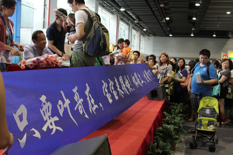 粉丝中有拖儿带女带老妈老公的,有挺着大肚子的,还有广中医的一些老师学子们,都早早从各地赶来现场,挤满了整个签售区。叶哥的出现引发了现场雷鸣般的掌声和欢呼。在接下来的签名活动中,更是出现了书香节史无前例的情景:有粉丝当场拉着横幅,上书"只要叶哥在,宝宝来得快!怀得上,生得下!"有粉丝现场派送起红鸡蛋、鲜花,她们说正是叶哥的精心治疗才让她们怀上了,生下了,才拥有了与他人分享这份喜悦的资格。