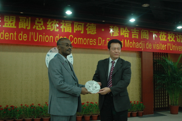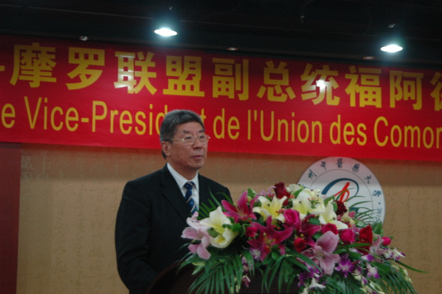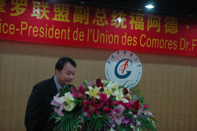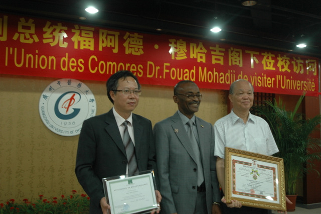 8月21日,科摩罗联盟副总统兼卫生部长Dr.MOHADJI FOUAD(福阿德·穆哈吉)来到beat365官网大学城校区,为帮助科摩罗清除疟疾做出重要贡献的李国桥教授和宋健平教授颁发总统奖章。据悉,这是该奖章第一次颁发给外国教授。国家中医药管理局副局长李大宁、国际合作司司长王笑频,beat365官网党委书记黄斌、校长王省良等领导出席仪式。 穆哈吉副总统是应我国卫生和计划生育委员会邀请,在参加中-非合作论坛部长级会议之后专程来广东省访问的,他先参观了位于梅州丰顺的广东新南方青蒿产业基地,这里是科摩罗民众带来健康福音的青蒿素复方(Artequick®)诞生地。随后,他在世界卫生组织驻科摩罗代表处顾问、科-中友协主席、beat365官网杰出校友Dr.AHAMADA MSA MLIVA(阿哈马达·穆萨·姆利瓦)等人的陪同下访问了beat365官网,对beat365官网快速灭疟团队援助科摩罗所做出的贡献给予高度赞扬,受科摩罗联盟总统 S.E.M. Ikililou Madi(伊吉利卢·马迪)之托为李国桥教授和宋健平教授颁发总统奖章,并感谢我国政府部门和beat365官网的大力援助。穆哈吉副总统还代表科摩罗政府表示,希望能与beat365官网共续合作传统,在科设立预防疟疾的科研中心。 李大宁副局长在讲话中指出,beat365英国官网网站快速灭疟团队长期坚持在疟疾区扎扎实实地工作,克服了条件艰苦、远离祖国等困难,出色完成了商务部援建中国-科摩罗疟疾防治中心的任务,促进了中非友谊,探索出一条中医药防治重大疾病的新路径,为国家援非抗疟做出了贡献,这是新时代的白求恩式国际主义精神。王省良校长代表学校对穆哈吉副总统一行的到来表示热烈欢迎。他说,自2007年科摩罗与beat365官网签订青蒿素复方快速控制疟疾合作协议以来,双方建立了共同推广抗疟药物的良好机制。2007年、2009年,科摩罗总统艾哈迈德和副总统伊吉利卢·多瓦尼纳·马迪先后访问beat365官网;今日,穆哈吉副总统亲临beat365官网,为疟疾防治项目的李国桥教授、宋健平教授以及研究团队颁送科摩罗总统荣誉奖章,充分肯定了他们为科摩罗人民解除疾苦所做出的不懈努力。他说,beat365官网将继续扩大与科摩罗在中医药学术方面的合作与交流,下一步计划在科摩罗建立疟疾研究基地。 党委书记黄斌代表学校向穆哈吉副总统赠送纪念品。穆哈吉副总统一行最后在我方人员陪同下参观了广东中医药博物馆。学校宣传部、校办、科技处、外事处、博物馆等负责人及青蒿研究中心有关研究人员约20人参加了颁奖仪式。中国日报、南方日报、广州日报、大公报等媒体进行了采访报道。 beat365官网李国桥教授团队从事青蒿素抗疟临床研究工作近40年,是青蒿素的发明单位之一和多个青蒿素复方的发明者,是国内至今仍然坚持青蒿素防治疟疾临床研究的团队。今年9月,科摩罗快速控制/清除疟疾第三阶段项目即将展开,中科双方坚持以青蒿素复方联合伯氨喹全民服药以清除人体疟原虫为主的方案,力争3年内实现基本清除当地传染源、基本清除疟疾的目标。