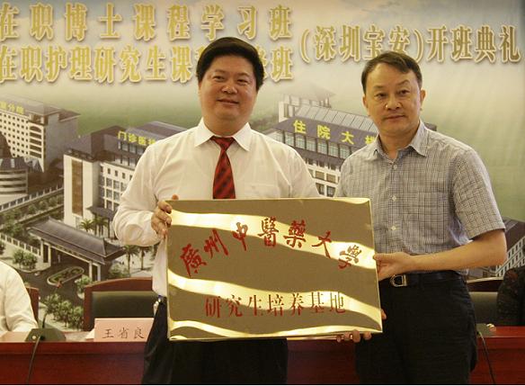 王省良校长亲手将"beat365英国官网网站研究生培养基地"牌匾授予宝安中医院林晓生院长,并对医院在研究生招生、培养、学位授予工作中寄予期望。