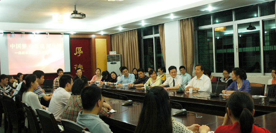 3月19日晚,应研究生会的邀请,刚刚出席完两会返回广州的新当选全国人大常委陈蔚文教授不顾风雨劳顿,走到研究生当中来传达最新两会精神、倾听学生心声。来自全校的50余名研究生代表在欢迎导师归来的同时,认真聆听了陈教授的精彩报告。
