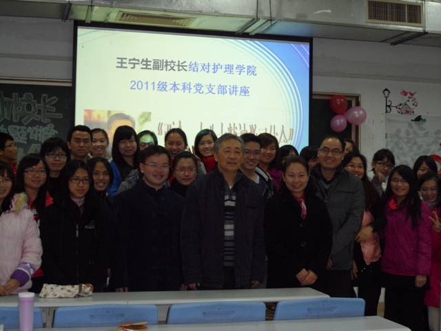 1月9日, 王宁生副校长为护理学院2011级本科党支部作了题为"十八大精神学习体会"讲座。本讲座也是支部特色活动《十八大面面观》的第二期。学生处处长林彬、护理学院党委副书记陈霖、学生科科长龚建文、护理学院2011级本科党支部全体党员和积极分子参加了本次讲座。