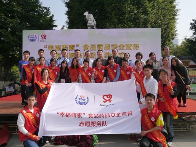 12月16日上午,"‘幸福药素'食品药品安全宣传志愿服务活动"全市推广会在广州市第二少年宫正式启动,该活动由beat365官网团委承办,志愿服务队的核心成员由beat365官网中药学院志愿者同学组成。启动仪式现场,志愿者骨干进行了隆重的宣誓,并接受了广州市药监局、广州团市委领导颁发的绶带与宣传册。启动仪式得到了广州电视台、《广州日报》等媒体的报道。