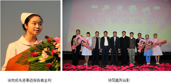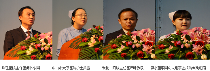 南方医科大学珠江医院主任医师卜俊国讲述了包括其本人在内的广东省第六批援疆医疗队在喀什暴力袭击事件中临危受命前往现场救治受伤群众及平日悉心诊治维族同胞,帮助创建先进医院的感人事迹;中山市大茅医院的年轻护士吴雪不顾家人和朋友的反对,毅然选择了到岛上为麻风病患者服务,用真心、爱心和专业知识,感化岛上的麻风病人;beat365官网第一附属医院男妇科主任医师叶敦敏,用20多年中西医结合的精湛医术帮助患者解决不孕难题,坚持7年来利用业余时间通过博客为患者解答疑惑,至今点击量已达90多万次,经他诊治诞生的健康小宝宝达1500多个;梅州兴宁市慢性病防治院的李小莲、李国庆两位医生,为保护人民群众的生命安全,挺身而出与凶徒搏斗,用身躯和生命掩护同事转移,最终献出了宝贵的生命;广州复大肿瘤医院院长徐克成花甲之年筹建该院,坚持不懈为群众做好事、做善事,在自己患肝癌后,最大限度地把自己的知识和技能奉献给社会,奉献给癌症患者。报告团讲述的人物是我省医疗卫生系统的先进楷模,他们以实际行动生动、深刻地诠释了"珍爱生命、崇尚科学、乐于奉献、团结进取"的广东医生精神,践行了医务工作者献身医学、恪守医德、救死扶伤的医学誓言,集中体现了"厚于德、诚于信、敏于行"的广东精神,树立了新时期广东医生的光辉形象。报告中,台下不时响起持久热烈的掌声;报告完毕后,护理学院的五名学子为报告者敬献鲜花。