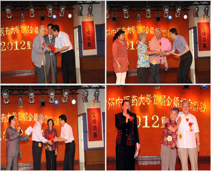在欢快的乐曲声中,金婚夫妻依次登台亮相,黄斌书记、王省良校长、孙晓生副书记分别为每对金婚夫妇颁发证书和纪念品。他们以各自不同的方式进行真情表白,向自己的伴侣表达浓浓的爱意:有的给妻子说句爱的宣言、唱一首动情恋歌、吟诵一首自己创作的爱情诗,有的给老伴一个热情拥抱或深情的吻等,在这热烈欢快的舞台上把自己过去几十年一直埋在心里的浓浓爱意倾刻强烈地表达出来。在参加金婚纪念活动的老同志当中,有经历过抗日战争到解放战争炮火洗礼而结合在一起的,有参加过抗美援朝战争而转业到beat365官网的老同志。95岁高龄的老红军、原学校党委书记王永祥夫妻历尽艰辛互敬互爱已经走过了70个春秋。而大部分的老同志经历过新中国的诞生、发展与壮大的历程,顺利地走到今天真是不容易。他们从相知到相爱,在共和国建设的艰苦岁月里并肩战斗,把青春、理想与党和人民的事业紧紧联系在一起,把家庭与感情深深融入到教育事业的发展中,为培养中医药人才,在长年的教育工作中倾注了心血和汗水,为党的教育事业做出了重大的贡献。夫妻间五十年长相知,知心知意知冷暖;五十年常相伴,伴风伴雨伴春秋;岁月穿梭而过,真情历久弥新,实践了"执子之手、与子偕老"的金婚誓言。在今天美满的日子里,老同志们都感慨万千,大家都衷心感谢党、感谢改革开放给大家带来今天的幸福生活,感谢学校对大家的关心和关爱。整个祝福活动都沉浸在欢快喜庆的气氛之中,最后金婚夫妇在一起合影留念,留下永久而使人难以忘怀的美好记忆。向着希望和追求,庆金婚天长地久。
