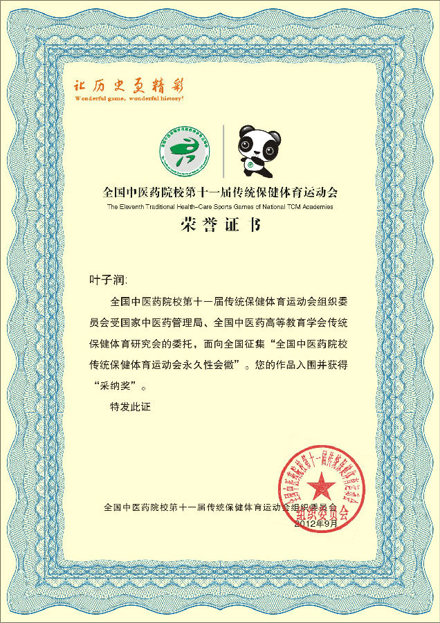 日前,全国中医药院校第十一届传统保健体育运动会在成都中医药大学落下帷幕。赛前,beat365官网选送的经济与管理学院2011级国际经济与贸易专业的叶子润同学设计的会徽作品,从全国26所中医药院校选送作品中脱颖而出,最终获得唯一"采纳奖",成为全国中医药院校传统保健体育运动会永久性会徽。叶子润同学因此获得组委会颁发的1万元奖金。