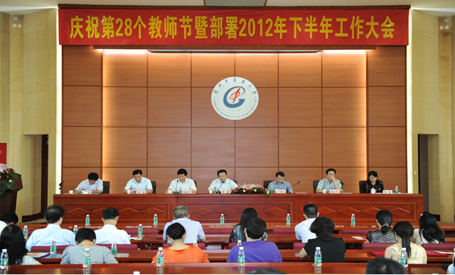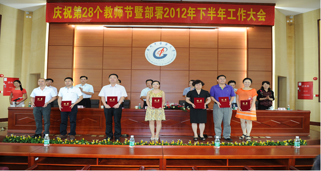 9月11日,学校在大学城校区召开庆祝第28个教师节暨部署2012年下半年工作大会。在校全体校领导黄斌、王省良、孙晓生、陈英华、刘晟、郭姣、许能贵出席会议并颁奖,学校党委书记黄斌、校长王省良还对学校今年下半年的工作进行了部署。会议由学校党委副书记孙晓生主持。