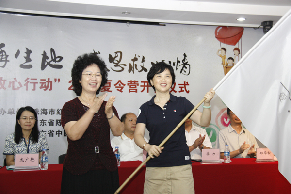 珠海市人大副主任、市红十字会会长邓群芳(左)为夏令营授旗