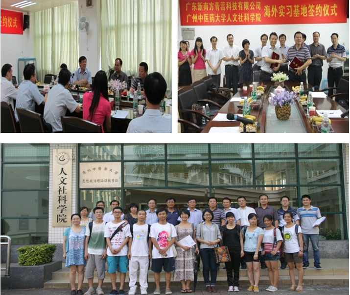 5月9日下午,人文社科学院与广东新南方青蒿科技有限公司海外实习基地签约仪式在人文楼举行。副校长许能贵、教务处副处长林良才、学生处副处长潘伟增、青蒿研究中心副主任宋健平、广东新南方青蒿科技有限公司总经理潘隆华、广东紫和堂大药房有限公司戴征国总经理、人文社科学院党政领导班子及部分师生代表参加了签约仪式。李悦书院长和潘隆华总经理分别代表人文社科学院和新南方青蒿科技有限公司签订了《开发国外研究实习基地合作协议》。