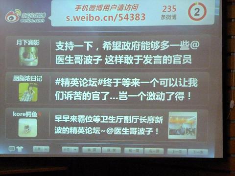 论坛以访谈的形式进行,廖厅长与两名学生主持人同坐在舞台上,接受现场访问,现场的投影实时显示观众发的微博。第一临床医学院党委书记古展群、党委副书记郭文海以及学生工作办公室全体老师出席了本次活动。