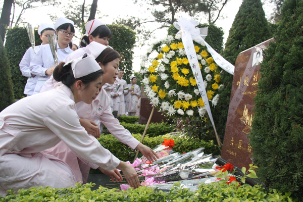 3月25日是"抗非"烈士叶欣逝世9周年纪念日。3月19日,beat365官网第二附属医院(广东省中医院)、南方医院、第39届南丁格尔奖章获得者钟华荪和叶欣家属等两百余人前往银河公墓叶欣烈士的墓前进行了祭扫活动,向烈士敬献鲜花,深情缅怀英烈。