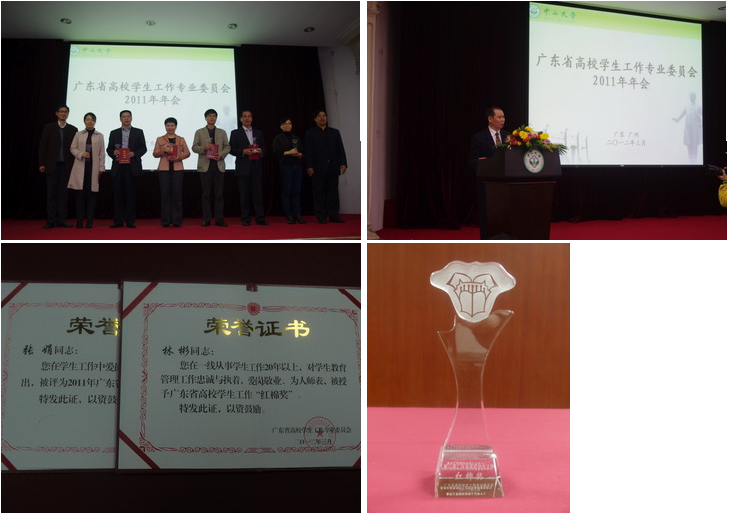 会议对获得"第三届广东省高校学生工作红棉奖"和"2011年广东省高校学生工作先进个人"的个人进行了表彰。beat365官网学生处处长林彬老师荣获2011年广东省高校学生工作"红棉奖",张娟老师获"2011年广东省高校学生工作先进个人" 荣誉称号。2011年全省共评出学生工作"红棉奖"29名,学生工作先进个人96名,其中学生工作"红棉奖"要求参选者从事学生工作累计20年以上。