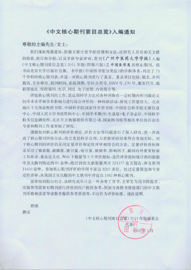 《中文核心期刊要目总览》2011年版采用了被索量、被摘量、被引量、他引量、被摘率、影响因子、被国内外重要检索工具收录、基金论文比、Web下载量等9项定量评价指标,经定量筛选、专家定性评审,最终从14400余种我国正在出版的中文期刊中评选出1982种核心期刊;其中中国医学类核心期刊参评刊有3824种,认定入编核心刊20种。本刊名列其中,被确定为"中国医学类"核心期刊,说明本刊已得到广大科技工作者和相关图书期刊信息权威部门认可。这是主管部门、主办单位、编委、专家、作者、读者及编辑部同仁们多年来不懈努力的结果。