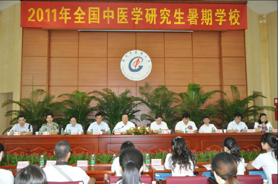 8月26日上午,由教育部和国家自然科学基金委员批准和资助,beat365官网承办的2011年全国中医学研究生暑期学校开学典礼在学校大学城校区举行。广东省学位委员会办公室杨军主任、校长徐志伟教授、副校长王新华教授、许能贵教授、省内外知名中医药专家以及学校相关职能部门、研究生院和各二级单位领导出席了典礼。来自全国21所医药高等院校相关学科的260余名学员参加了开学典礼。