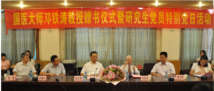 国医大师、学校终身教授邓铁涛满怀对党的浓厚感情,以自己的亲身革命经历为研究生上了一堂生动的党课,震撼了研究生党员的心灵。邓老认为,中国共产党不仅坚持马列主义思想的指导,更凝聚中华文化的精髓、发展中医药,鼓励中医学子坚定对党的信念、对中医的信念。他勉励学生们要增强振兴中医的使命感和责任感,秉承"医者仁心"的信念济世救人;希冀研究生党员努力学好本领,造福人民,为世界人民做贡献。听完邓老语重心长的教诲,研究生党员们激情昂扬,对"大医精诚"有了更加深刻的理解。活动期间,邓老向学校捐赠图书(《文澜铁涛——邓铁涛教授报道集锦》、《国之瑰宝——中国国医大师录》),作为献给中国共产党党成立90周年的礼物。研究生党员近距离目睹大师风范,聆听大师教诲,深受启发和教育。