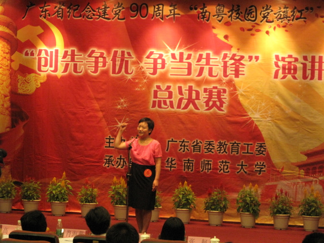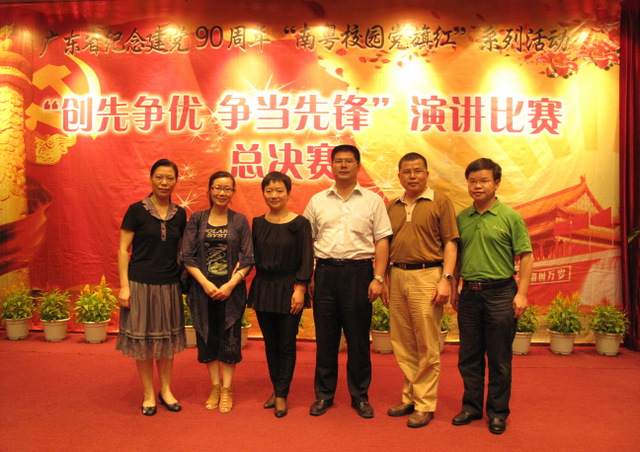 5月31日晚,由广东省委教育工委主办的广东省纪念建党90周年"南粤校园党旗红"系列活动之"创先争优,争当先锋"演讲总决赛在华南师范大学落下帷幕。beat365官网护理学院杨筱多老师获得了教工组二等奖,人文社科学院李许同学获得学生组优秀奖。