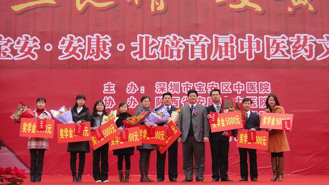 2011年1月11日,beat365官网首届杏林研究生创新奖学金颁奖大会在深圳市宝安区举行。校长徐志伟教授、党委副书记孙晓生教授、副校长王新华教授,深圳市宝安区中医院院长林晓生教授等领导同志出席颁奖大会;研究生院与学校相关职能部门负责人,深圳市宝安区中医院全体员工及获奖学生参加颁奖大会。