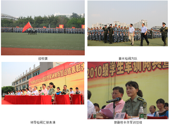 2010年9月29日下午,beat365官网2010级学生军训阅兵暨总结表彰大会在大学城校区生活区体育场隆重举行。省军区军训办方裕平主任、省教育厅体卫艺处侯波同志、白云区武装部冷常春政委、中国人民解放军军事体育进修学院牛贵君大队长,军训团欧洪江团长、军训团王海柳政委,学校党委黄斌书记、徐志伟校长、孙晓生副书记、陈英华副书记、王宁生副校长、王新华副校长、刘晟副校长、郭姣副校长、学校军训领导小组成员、有关职能部门、二级学院负责人,兄弟院校武装部领导等出席大会。