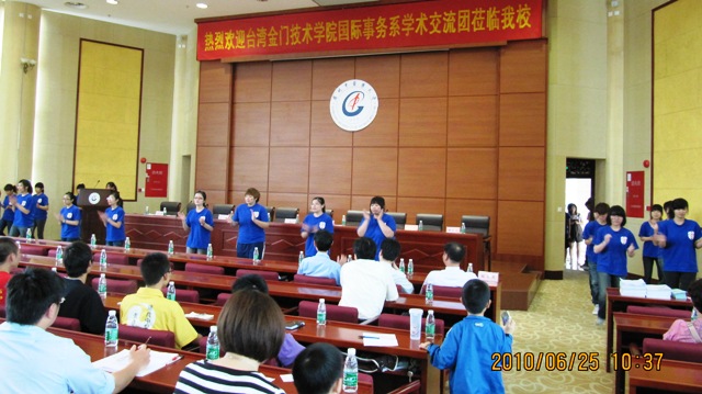 6月25日上午,来自台湾金门技术学院国际事务系的学生代表团一行80人在省台办交流交往处黄秋鸣副处长的陪同下,到beat365官网参观访问,并与beat365官网同学举行了气氛热烈的学生交流活动。