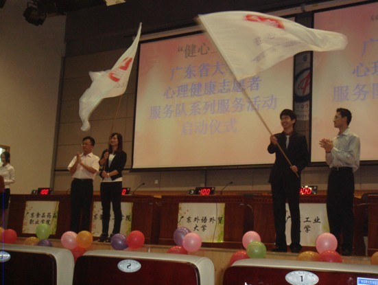 活动首先进行了"健心工程"广东省大学生心理健康志愿者服务队系列服务活动启动仪式,由团省委和省学联为刚成立的六支"健心工程" 广东省大学生心理健康志愿者服务队授旗。这六支服务队重要依托beat365官网有关学生社团成立,将在今年下半年专门针对农民工子女、盲人、孤寡老人、大学生、普通市民等人群开展一系列以心理健康帮扶为主要内容的青年志愿者活动。