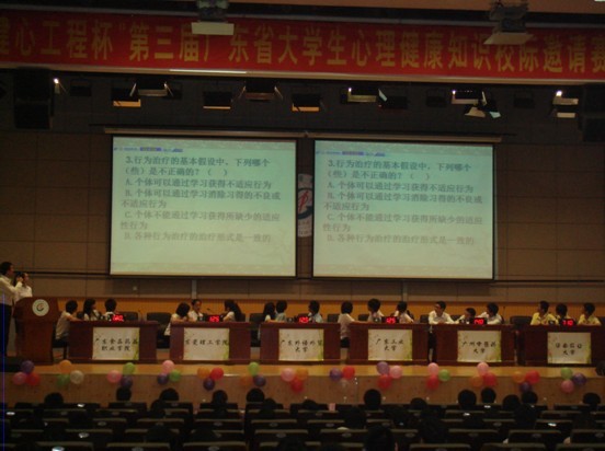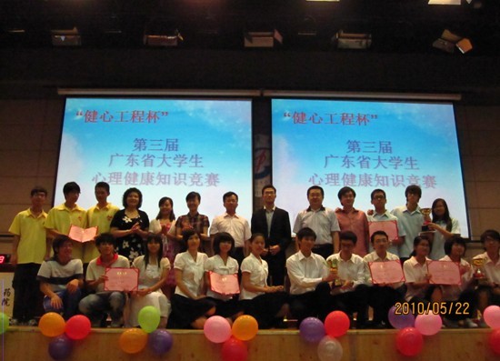 2010年5月22日,"健心工程"广东省大学生心理健康志愿者服务队系列服务活动启动仪式暨"健心工程杯"第三届广东省大学生心理健康知识校际邀请赛总决赛在beat365官网隆重举行。团省委学校部科长邓倩文,省学联执行主席杨右森以及来自全省十多所高校的心理健康专家、心理健康学生社团代表参加了活动。