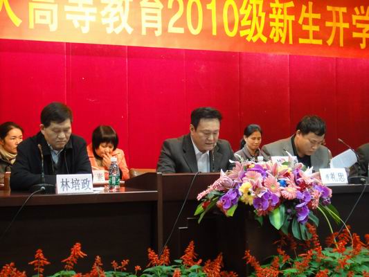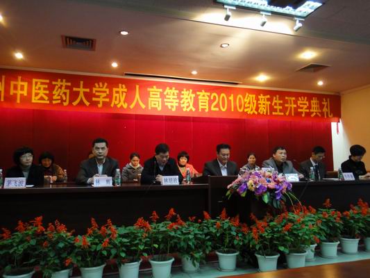 3月7日下午,beat365官网成人高等教育 2010 级新生开学典礼在三元里校区隆重举行。会议由林培政副校长主持。学校党委黄斌书记、广东省中医药局曹礼忠副局长出席会议并致辞。广东省中医药局科教处李梓廉处长及beat365官网相关职能部门、二级学院的领导和近1500名成教新生出席了大会。