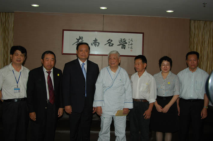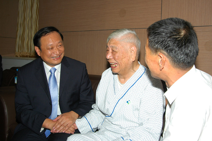11月9日下午,国家卫生部副部长王国强、广东省政府副秘书长李捍东、广东省卫生厅副厅长彭炜、国家中医药局新闻办主任蒋健、大学党委书记黄斌等一行在一附院党委古展群书记、樊粤光院长的陪同下来到医院,亲切探望了19年医患情缘的主角——84岁袁浩老教授和河南农民李敬斋。