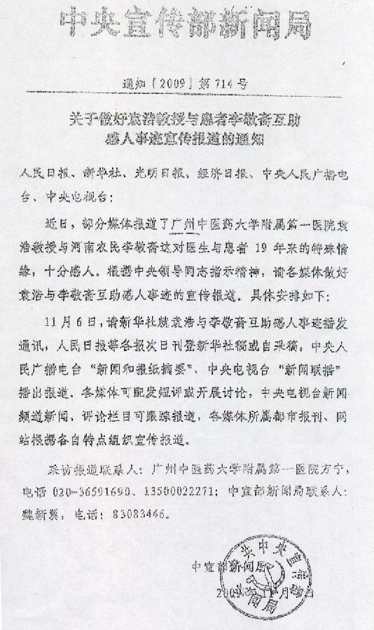 下午三点多,王副部长一行来到医院病房与袁浩教授、李敬斋大叔亲切攀谈起来。他深情地说:"袁浩教授的事迹十分感人,引起了全社会的广泛关注与巨大反响。我们非常感谢袁教授为全体医护人员树立起良好医德医风的榜样,祝愿袁教授早日康复、健康长寿。"王副部长还表示,袁浩教授与李敬斋的感人事迹折射出社会主义制度下良好的医患关系。现在社会需要这种大医精诚、救死扶伤、关心患者、帮助患者、维护健康的精神。在当前深化医疗体制改革的形势下,我们要充分调动医护人员的积极性,促进医患和谐。只有和谐,医疗事业才能更好发展,缓解老百姓"看病难、看病贵"矛盾才能取得成效。医患和谐关系的建立,医生有责任,患者也有责任。袁浩教授与李敬斋之间的感人事迹非常有现实意义,我们医护人员应该好好学习。