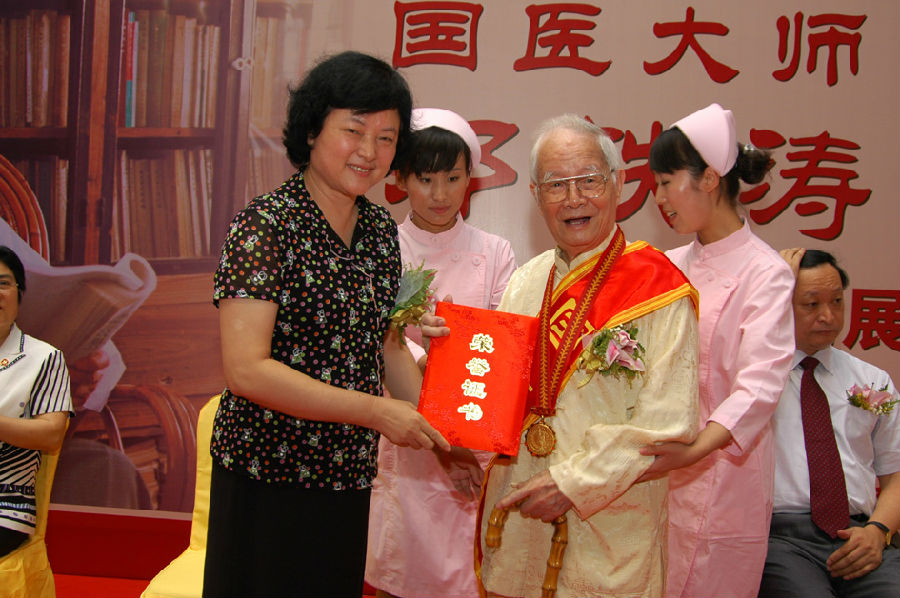 王国强副部长为邓老颁发"国医大师"证书和奖章,雷于蓝副省长为邓老颁发由广东省中医药强省建设联席会议授予的一次性特殊津贴以及国家级非物质文化遗产项目代表性传承人(中医诊法)奖章。