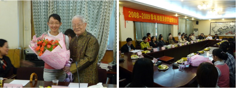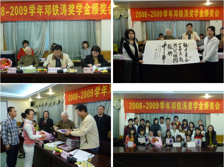 2009年3月31日下午,在学校三元里校区二楼会议室举行了2008-2009学年邓铁涛奖学金颁奖会。邓铁涛教授、陈英华副书记出席了会议,与会的人员还有学生处林彬处长、教务处邱仕君处长、学生处侯宁副处长、第一临床医学院郭文海副书记、第二临床医学院郑永臻处长、第三临床医学院江钢辉副书记、中药学院李明希副书记、经济与管理学院凌子平书记、针灸推拿学院官坤祥副书记、信息技术学院龚建文老师、护理学院方义洁书记、人文社科学院邓劲松书记、职业技术学院郭锡全副书记及获奖的25名学生。国医大师、全国名老中医、973首席科学家、beat365官网终生教授、邓铁涛奖学金的设立者邓铁涛教授亲自为获奖学生颁发了奖励证书及邓老的有关著作。