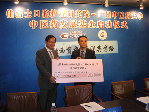 在beat365官网刚刚颁发了第三届台湾校友研究生奖学金之后,今天学校又与世界著名日化企业美国宝洁公司属下的佳洁士口腔护理研究院签署了中医药发展基金,本基金是佳洁士口腔护理研究院在全球的首个中医药发展基金。
