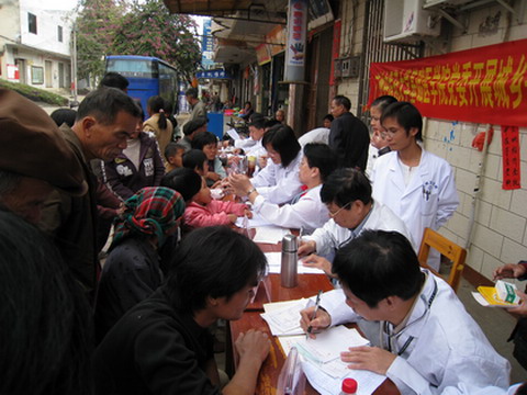 在陈群院长的带领下,专家们在镇政府门前进行义诊活动。在义诊现场,诸位专家教授被十里八乡闻讯而来的当地老百姓围的水泄不通,"我上腹平时很闷胀,不知是什么原因,今天听说beat365英国官网网站专家下乡来,免费看病,一大早就赶来了。"一位村民说。在大岗镇政府门口看到专家们的到来,村民们脸上充满了期盼和喜悦。专家们都认真为病人诊断治疗,老人、妇女、孩子都被深深感动,一位老奶奶从陈群院长手中接过免费的药品,双眼闪动着激动的泪光。专家紧张而认真的忙着为老百姓诊病,整个义诊活动共持续了三个多小时,为近400名群众义诊赠药,捐赠了价值近2000元的常用药品。