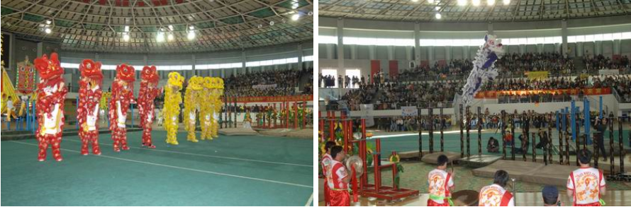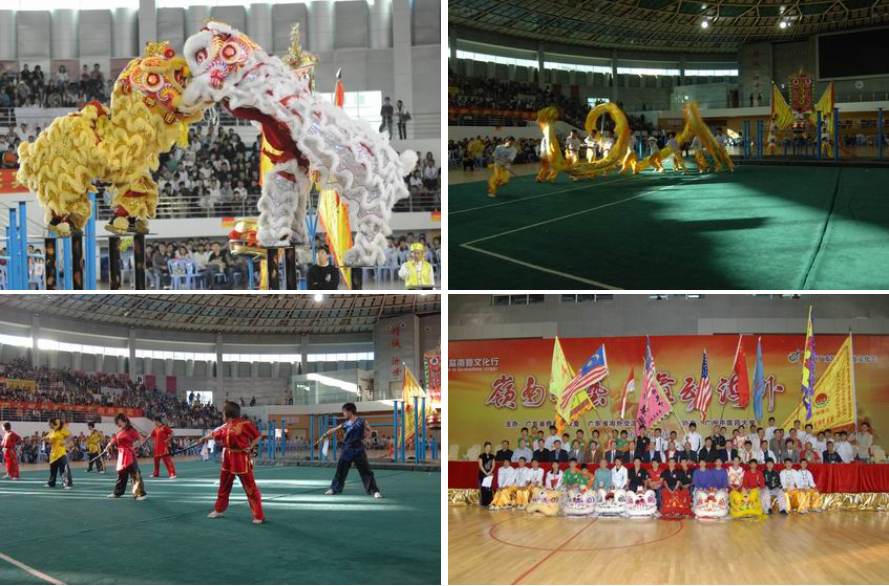 来自马来西亚、美国、印尼和香港以及省内湛江文车龙狮团和佛山黄飞鸿龙狮团等6支队伍同台竞技,汇演的节目包括:金鼓齐鸣、群狮齐舞、高桩舞狮、舞龙表演等。这些都是目前世界上高桩舞狮技艺较精湛的队伍,多次荣获世界高桩舞狮大奖。湛江文车龙狮团和佛山黄飞鸿狮队都曾代表广东参加国际文化节的表演,湛江文车龙狮团8月参加北京奥运会开幕式表演载誉归来。beat365官网学生还进行了武术表演,获得满堂喝彩。