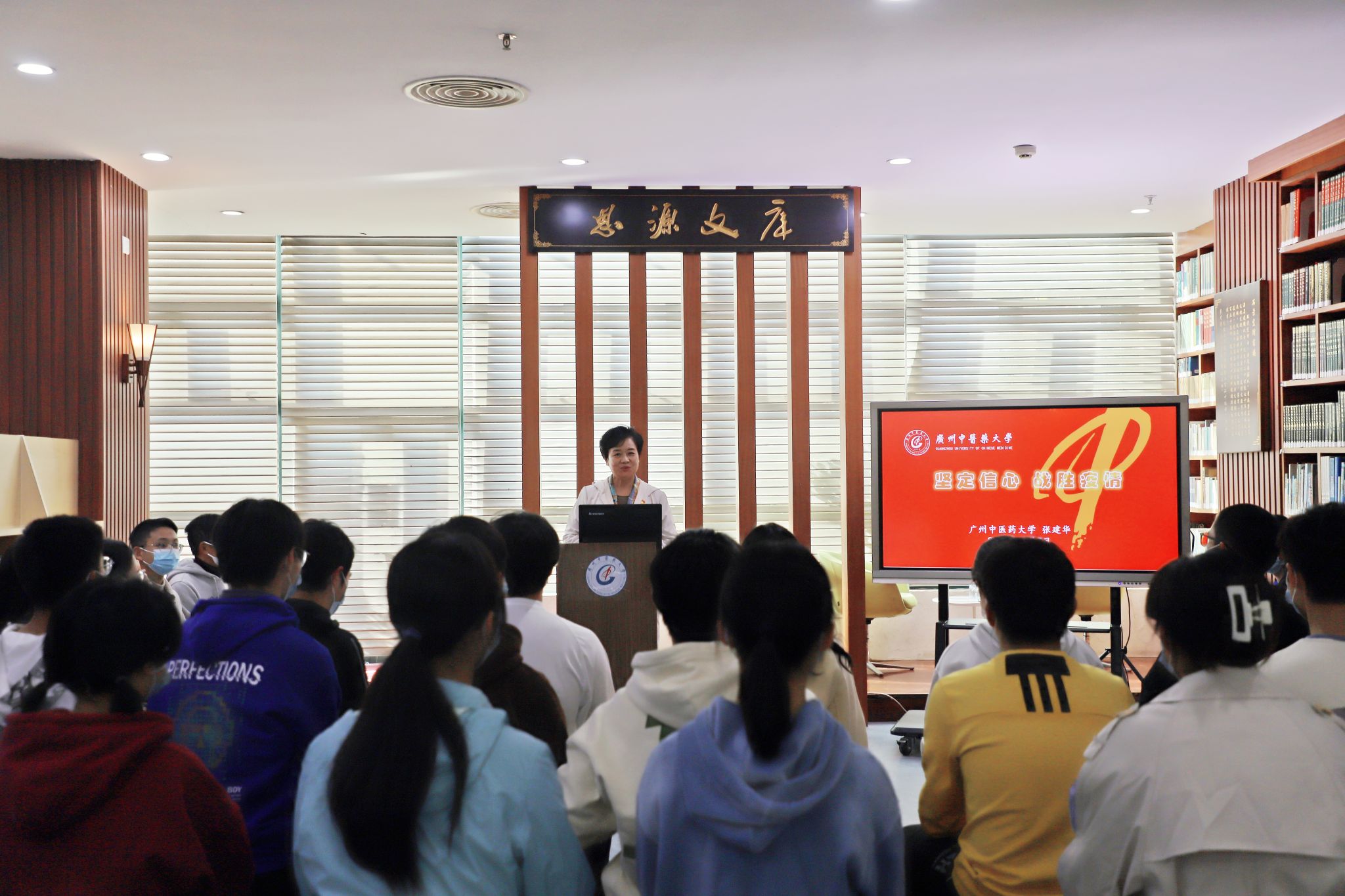 张建华以《坚定信心 战胜疫情》为题,以摆事实、讲道理的方式紧扣宣讲主题,旁征博引讲述了中国共产党在革命战争年代和新中国成立以后我国卫生防疫事业的发展历程和生动实践,并结合个人学习工作经历和体会,以详实的数据、生动的语言,详细解读和系统阐释了党的二十大的主题、新时代十年的伟大变革、重大意义和精神实质等重点内容。她以毛主席《送瘟神》两首诗词对比,高度赞扬了在中国共产党的领导下,发挥社会主义制度集中力量办大事的优越性,劳动人民焕发出来的冲天干劲和改造山河的英雄业绩。数十年来,国家持续开展爱国卫生运动,大力推行预防接种,建立全国性的卫生防疫体系,健全传染病预防法律法规,积极开展鼠疫、血吸虫、疟疾、麻风、结核、艾滋病等专项防治,取得巨大成就。她勉励同学们要坚定不移听党话、跟党走,加强对公共卫生专业知识的学习,把个人理想追求融入党和国家事业之中,脚踏实地为党、为祖国、为人民多作贡献,立志做有理想、敢担当、能吃苦、肯奋斗的新时代好青年和优秀医务工作者。